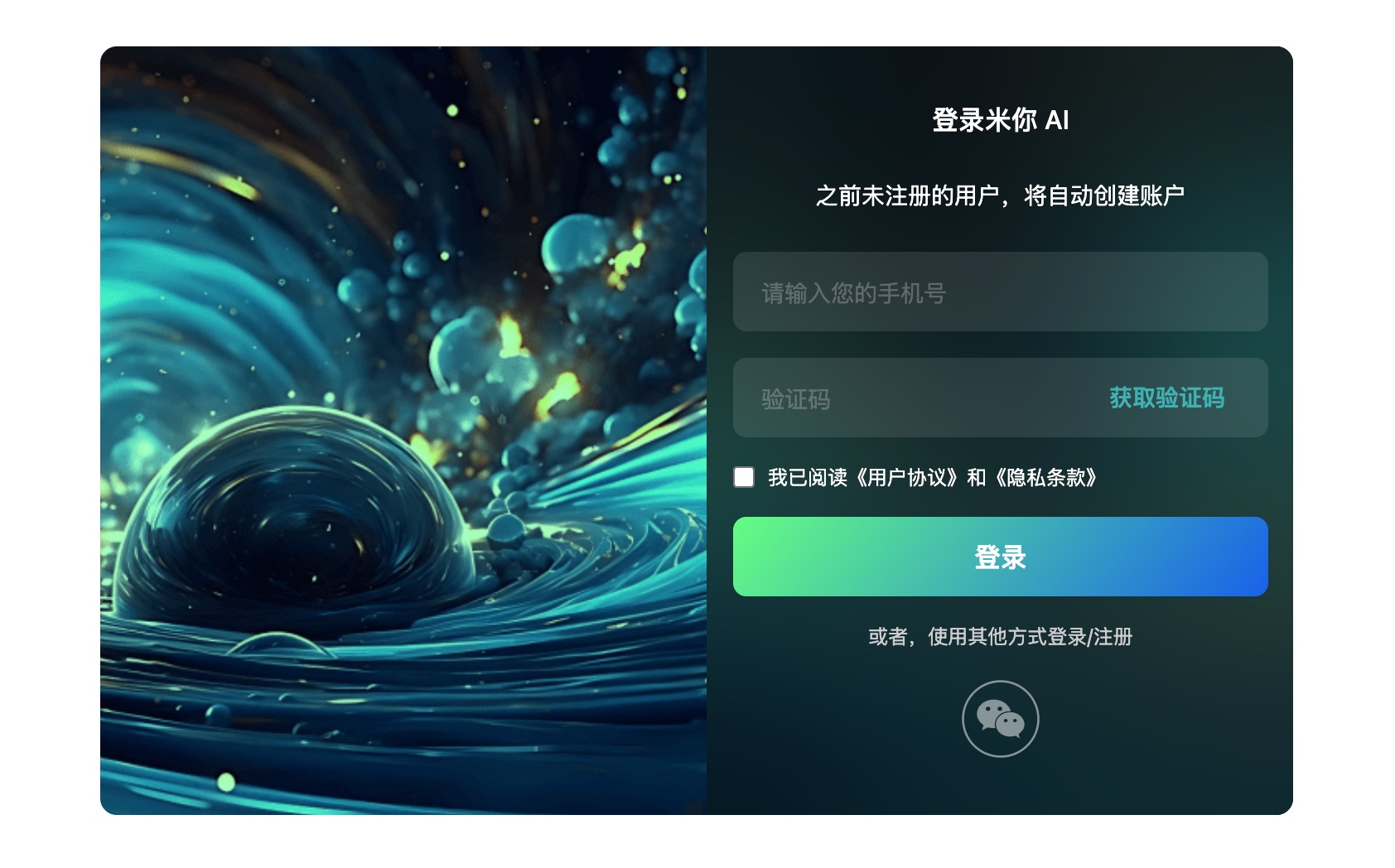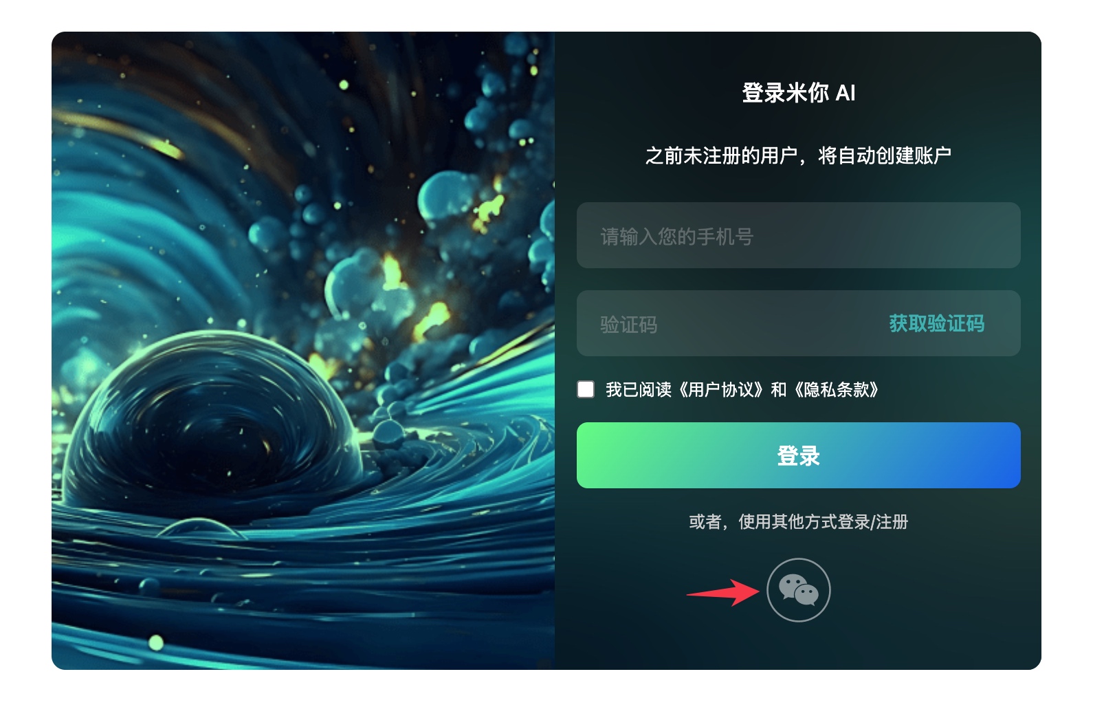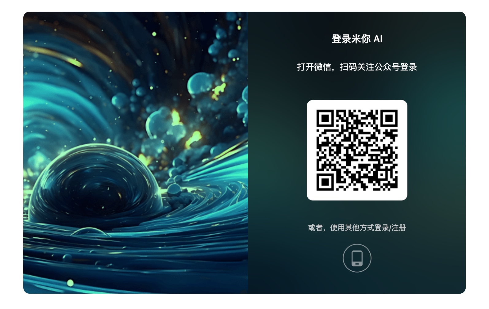 您可以使用手机号、微信扫码两种方式注册/登录米你AI。为了简化您的使用步骤,我们将登录和注册进行了合并处理。